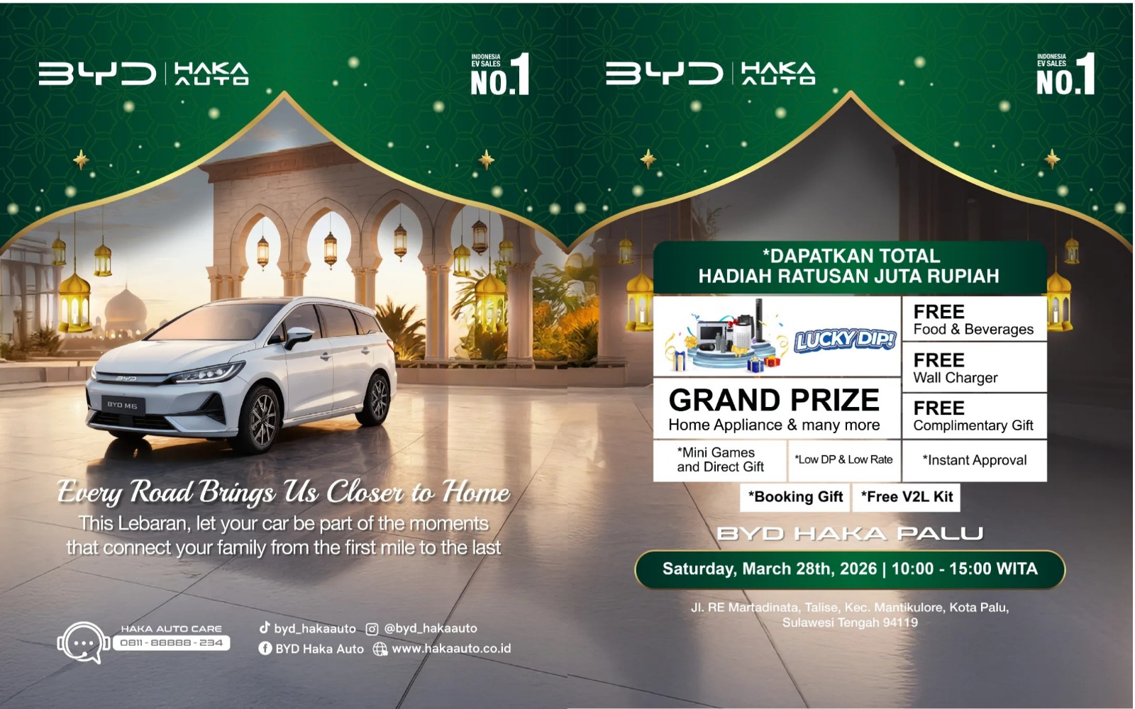 Narasita.com- Palu, — Showroom BYD Haka Palu menggelar kegiatan Showroom Event pada Sabtu (28/3/2026) di Jalan RE Martadinata, Palu. Kegiatan ini masih menjadi bagian dari rangkaian perayaan Idul Fitri 1447 Hijriah yang berlangsung sepekan sebelumnya.