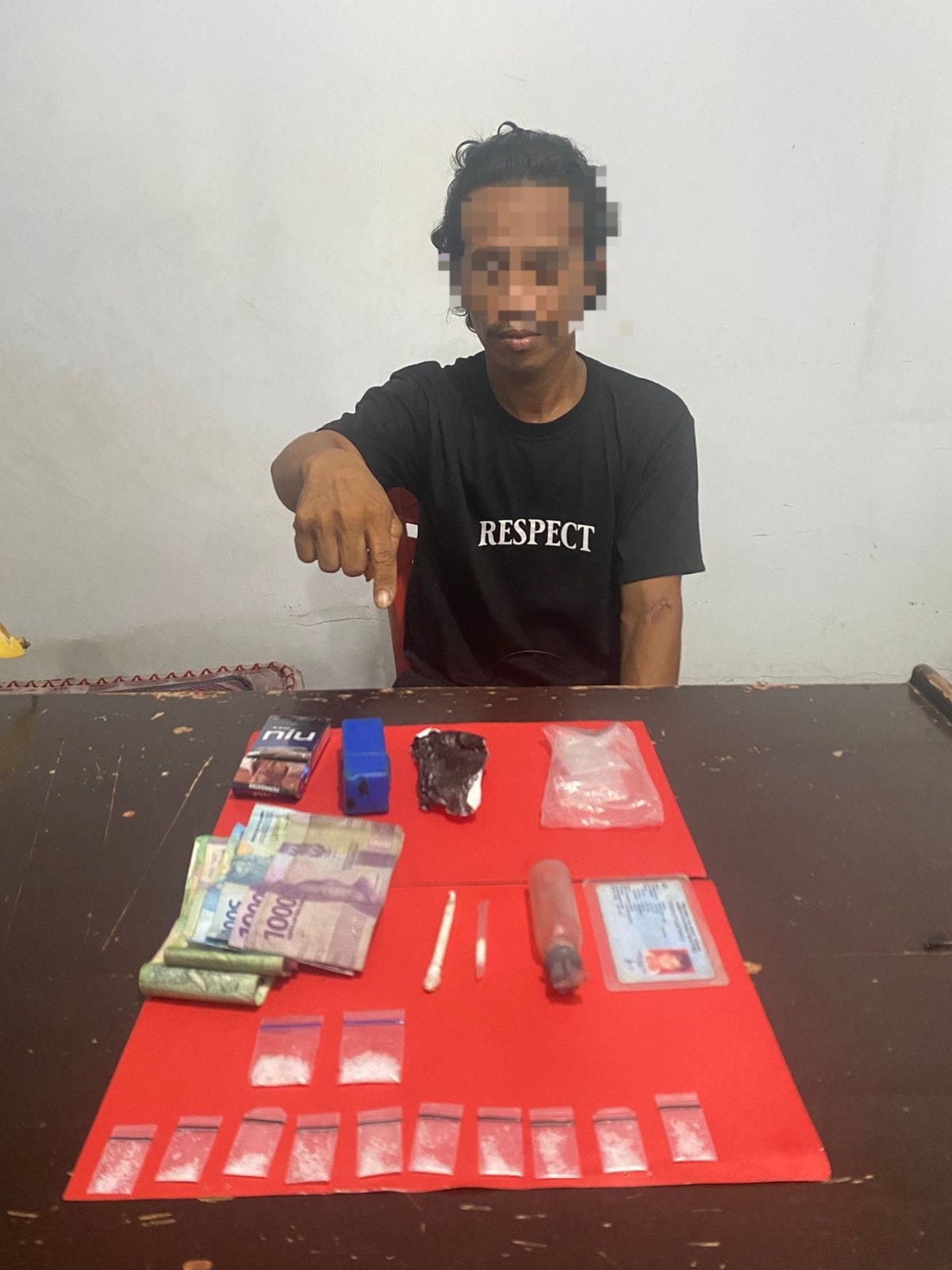 Penangkapan berlangsung tanpa perlawanan. Saat dilakukan penggeledahan di rumah pelaku, polisi menemukan sejumlah barang bukti berupa 12 paket sabu siap edar, satu alat hisap (bong), satu potongan pipet, satu kaca pireks, satu pak plastik klip bening kosong, satu kotak kecil berwarna biru, satu bungkus rokok merek NIU, satu lembar timah rokok, serta uang tunai sebesar Rp350.000. Selain itu, polisi juga menyita KTP milik pelaku.