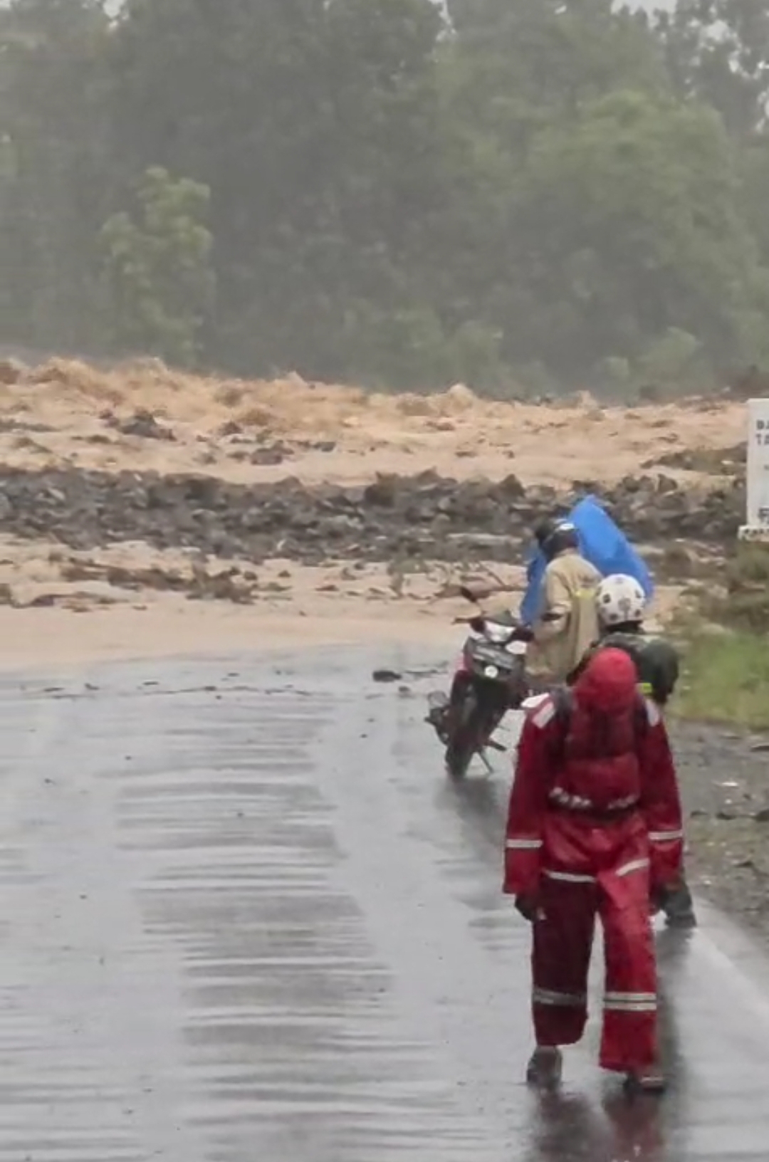 . Material longsor menimbun ruas Jalan Trans Ampana–Poso sehingga arus lalu lintas belum dapat dilalui kendaraan roda dua maupun roda empat.