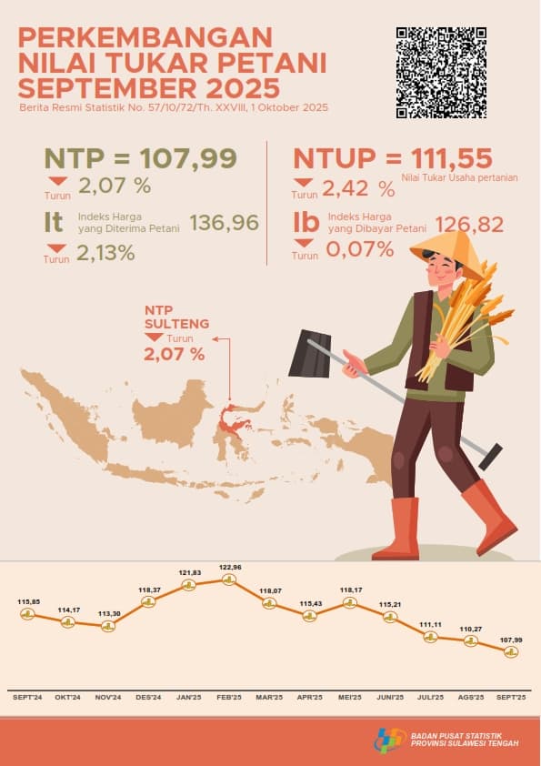 Narasita.com- Palu, – Nilai Tukar Petani (NTP) Provinsi Sulawesi Tengah pada September 2025 tercatat sebesar 107,99, turun 2,07 persen dibanding bulan sebelumnya. Penurunan ini dipicu oleh melemahnya indeks harga yang diterima petani (It) sebesar 2,13 persen, sementara indeks harga yang dibayar petani (Ib) hanya turun tipis 0,07 persen.