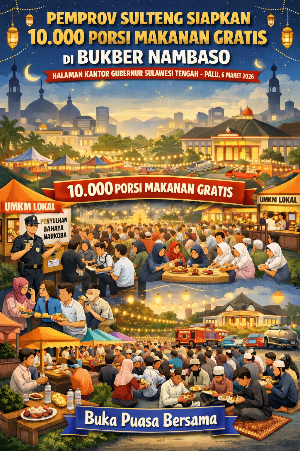 Narasita.com- PALU, – Pemerintah Provinsi Sulawesi Tengah akan menggelar Buka Puasa Bersama (Bukber) Nambaso di Halaman Kantor Gubernur Sulawesi Tengah, Kota Palu, pada 6 Maret 2026. Sebanyak 10.000 undangan ditargetkan hadir dalam kegiatan yang juga menyiapkan 10.000 porsi makanan gratis bagi masyarakat.