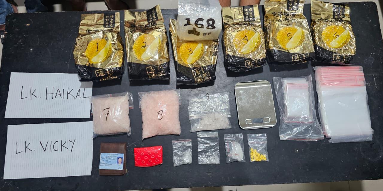 Dari lokasi, polisi menyita barang bukti berupa 6 kilogram sabu dalam bungkus plastik durian besar, dua paket sabu masing-masing seberat 1 kilogram dalam plastik bening, satu paket sabu ukuran besar, dua paket sedang, dan dua paket kecil. Selain itu, polisi juga menemukan 25 butir ekstasi warna kuning, alat isap, timbangan digital, plastik kemasan, dompet merah, satu tas besar warna hitam, serta sejumlah telepon genggam, termasuk iPhone 15, iPhone 13, dan dua unit Oppo.