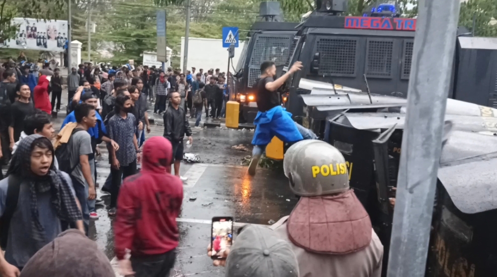 Menjelang pukul 18.00 WITA, aparat mulai mengambil langkah tegas. Setelah beberapa kali imbauan untuk membubarkan diri tidak digubris, polisi menurunkan pasukan anti huru hara. Massa yang bertahan didorong menjauh dari gerbang DPRD. Polisi kemudian menggunakan water cannon untuk menyemprotkan air ke arah kerumunan, bahkan menembakkan gas air mata untuk memukul mundur demonstran.