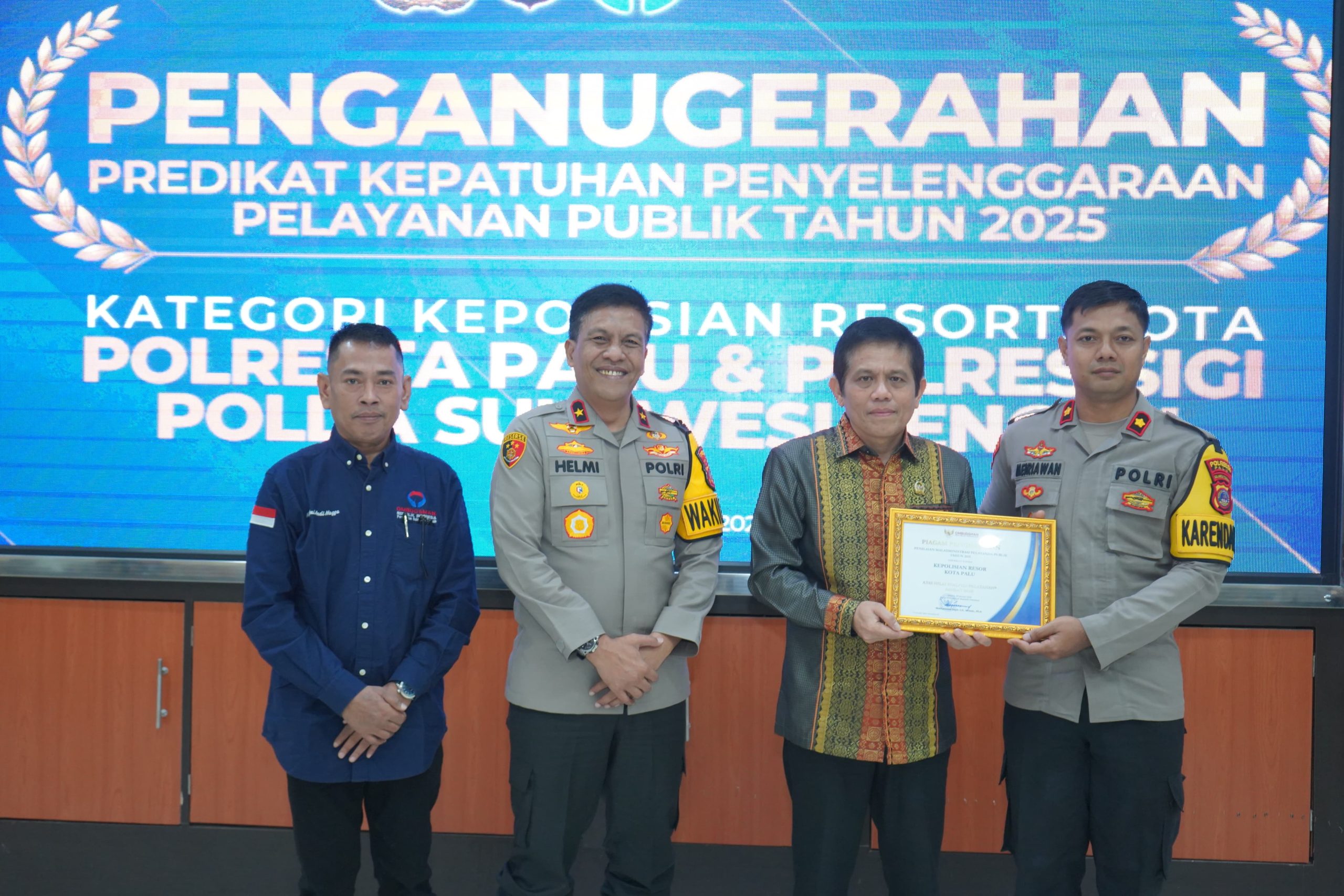 Narasita.com- PALU, — Polresta Palu meraih Penghargaan Predikat Kepatuhan Penyelenggaraan Pelayanan Publik Tahun 2025 dari Ombudsman Republik Indonesia. Penghargaan tersebut diberikan sebagai bentuk apresiasi atas komitmen Polresta Palu dalam menyelenggarakan pelayanan publik yang sesuai standar.