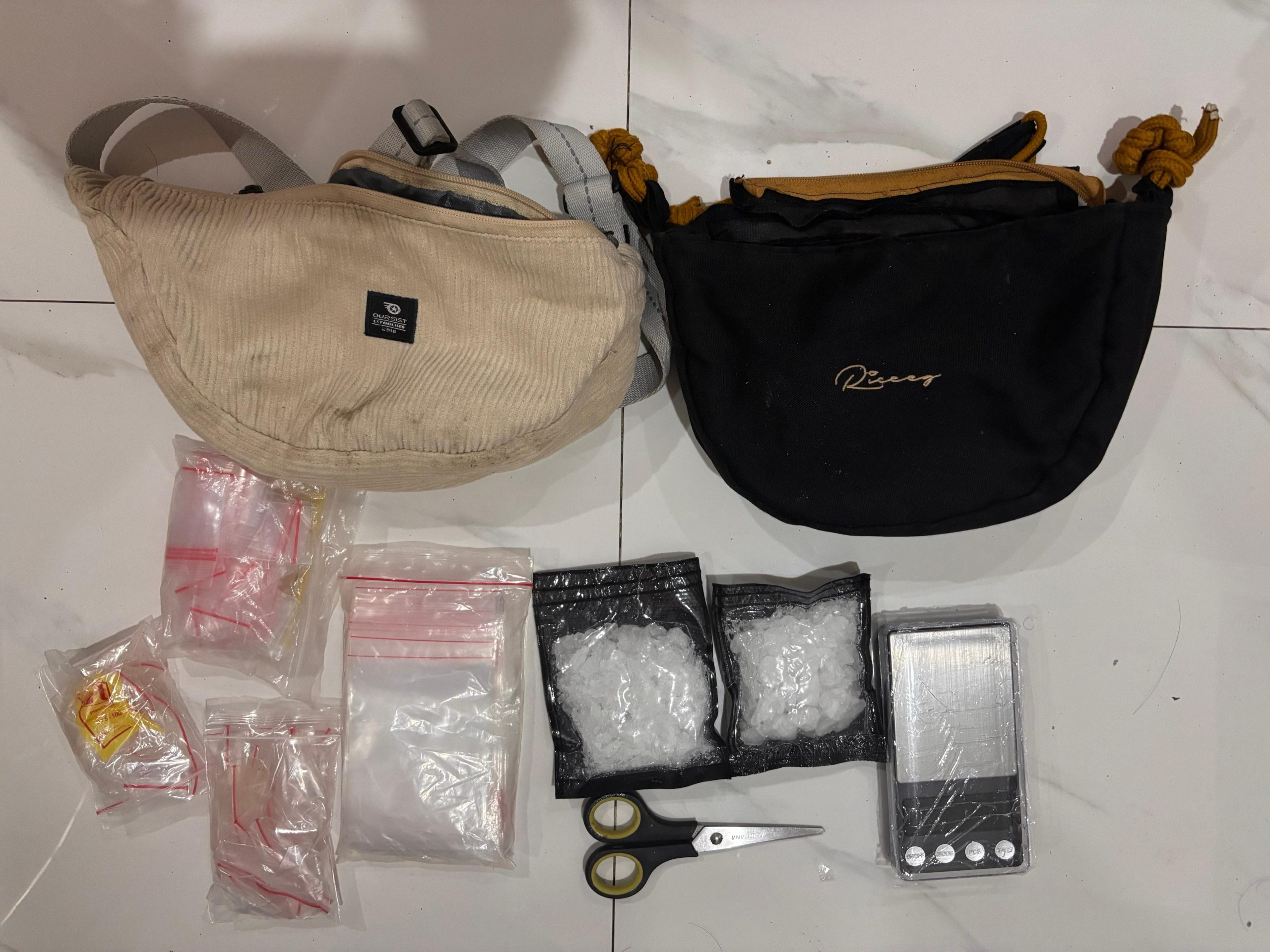 Selain sabu, polisi juga menyita sejumlah barang bukti lain dari dua lokasi kejadian perkara, yakni timbangan digital, pipet plastik, alat isap (bong), plastik bening, masker, tas samping, gunting, serta satu unit telepon genggam.