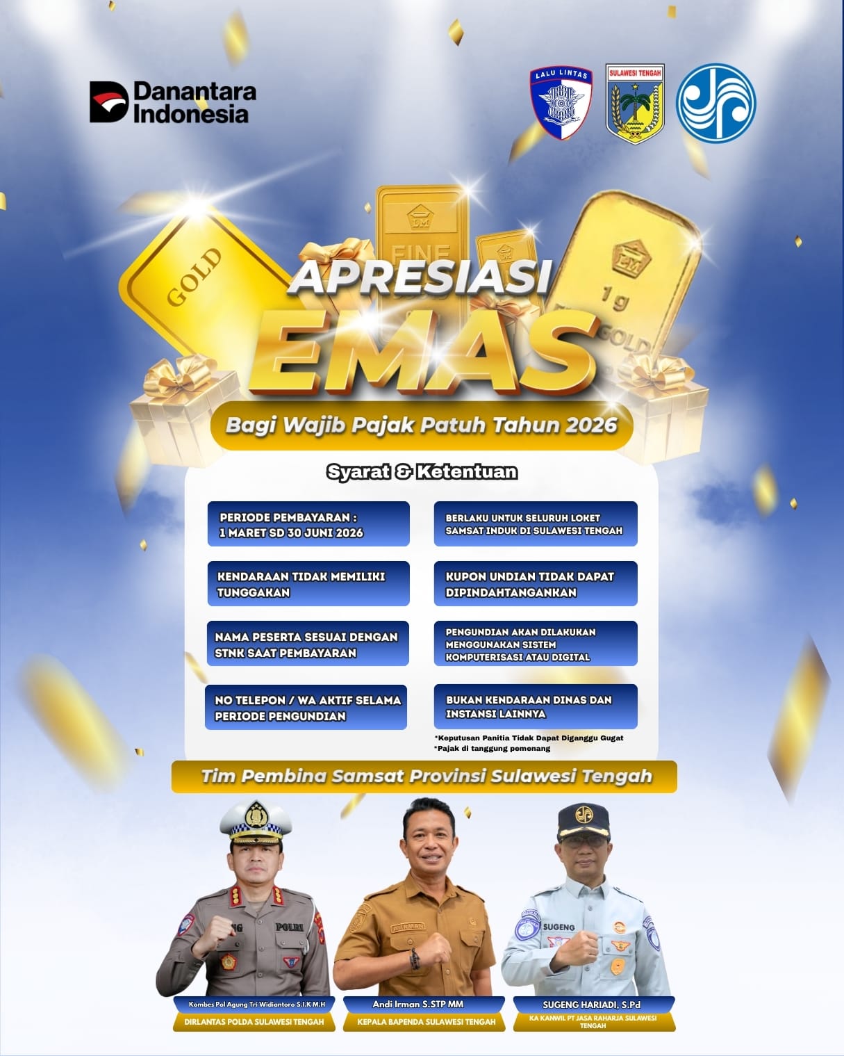 Narasita.com- PALU, — Masyarakat yang membayar pajak kendaraan bermotor sebelum jatuh tempo berkesempatan memperoleh hadiah emas melalui Program Apresiasi Emas 2026. Program ini berlaku hingga 30 Juni 2026.