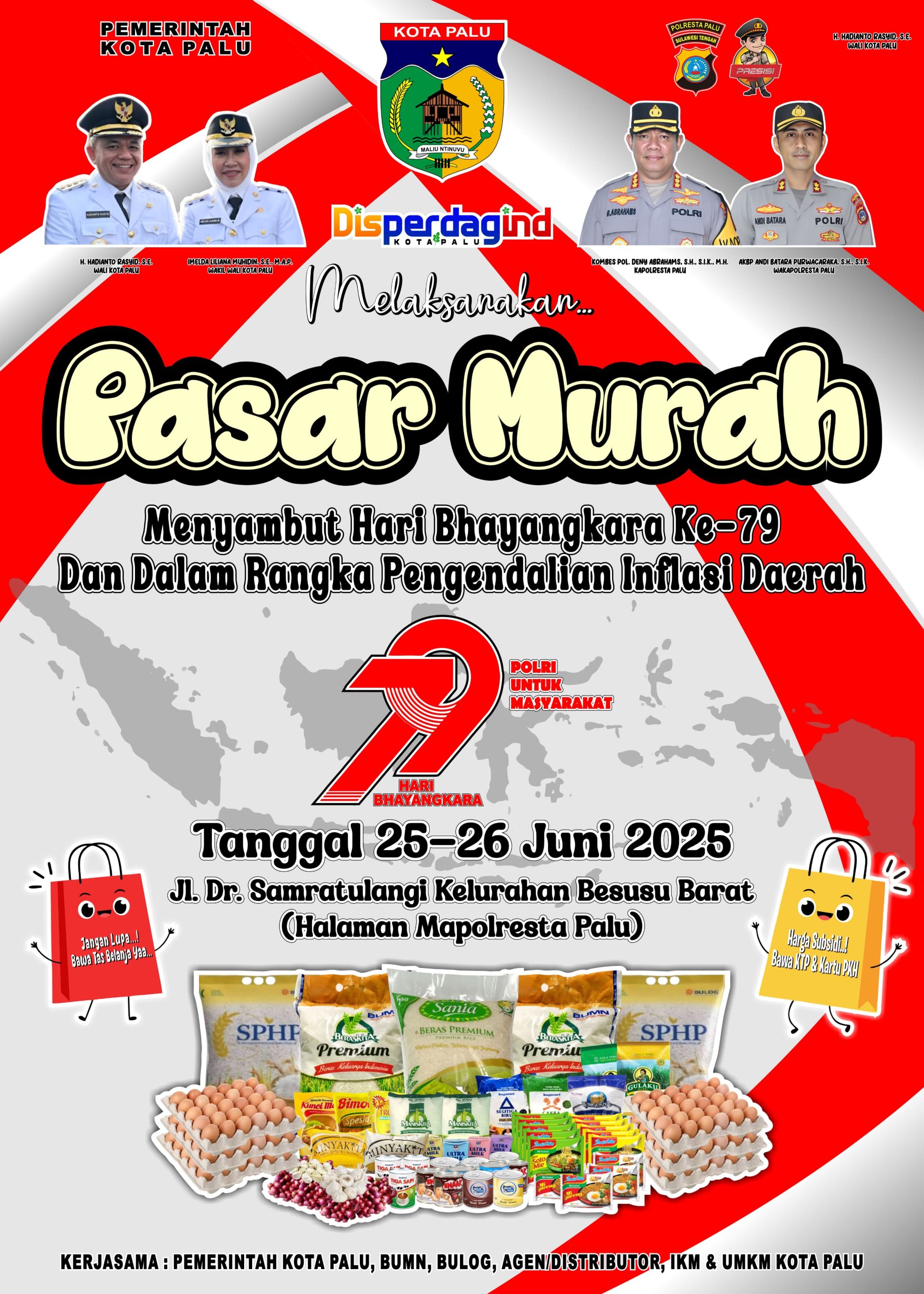 Narasita.com- PALU — Dalam rangka memperingati Hari Bhayangkara ke-79, Kepolisian Resor Kota (Polresta) Palu menggelar pasar murah selama dua hari, mulai Rabu (25/6/2025) hingga Kamis (26/6/2025). Kegiatan ini berlangsung di halaman Mapolresta Palu, Jalan Samratulangi No. 78, Besusu Barat, Kecamatan Palu Timur, dan mendapat sambutan antusias dari masyarakat.