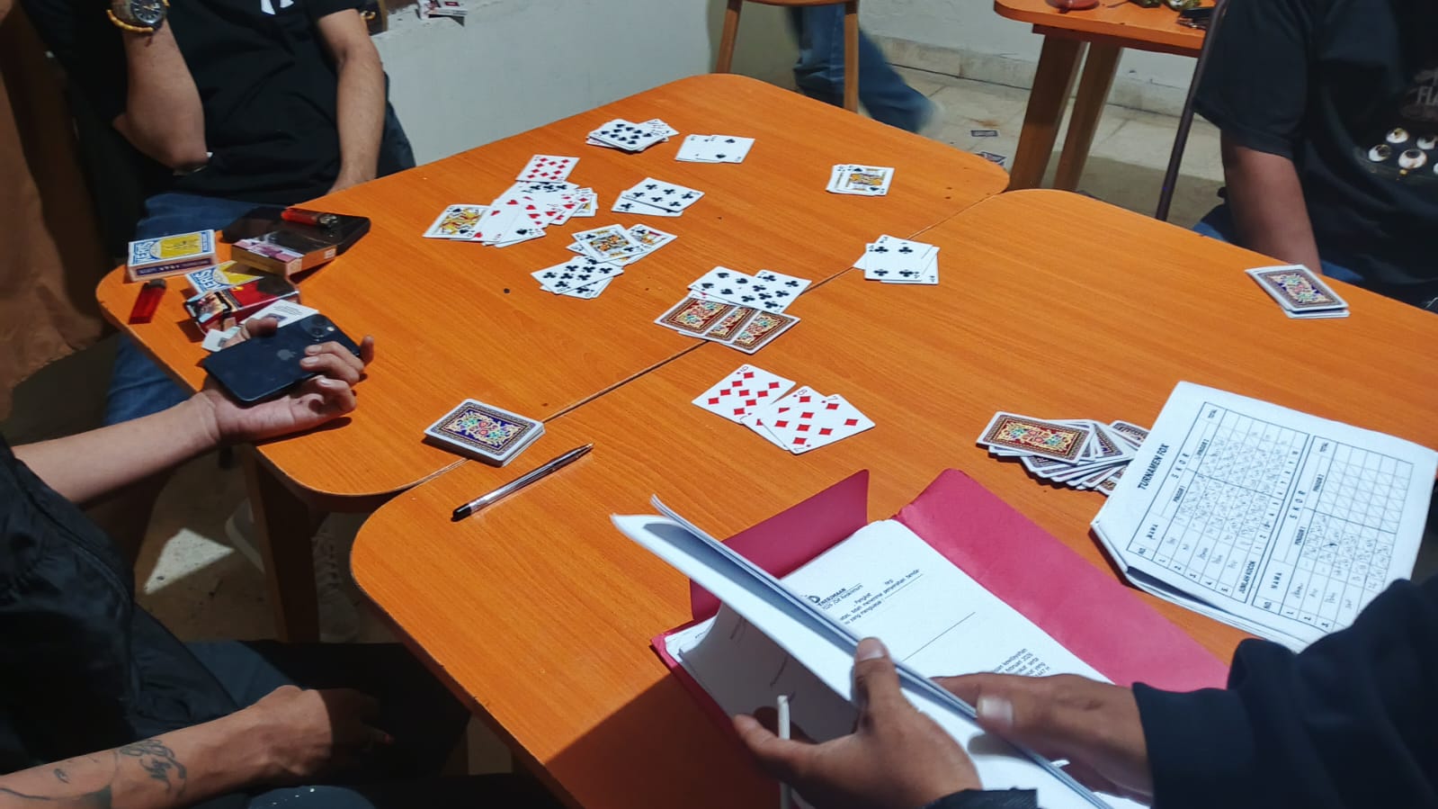 Saat penggerebekan berlangsung, petugas mendapati beberapa orang tengah bermain kartu. Tanpa perlawanan, mereka langsung diamankan. Polisi juga menyita barang bukti berupa kartu remi dan catatan taruhan dengan nominal ratusan ribu rupiah yang diduga digunakan dalam praktik perjudian.